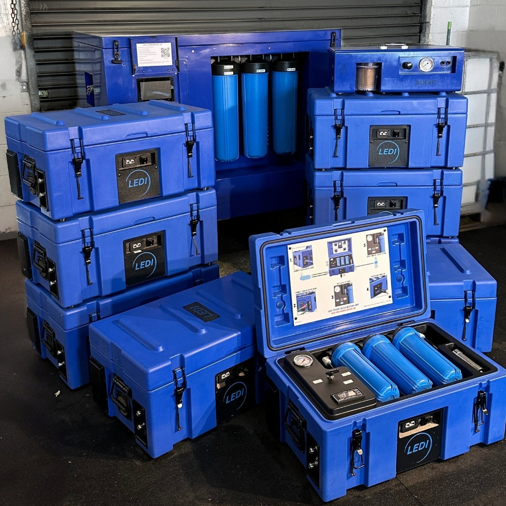 “We approached LEDI seeking a water purification and desalination capability that could be cached at disaster sites. LEDI designed and delivered 21 portable systems built into army trunks, each capable of producing around 90 l/h from seawater and roughly 150 l/h from fresh sources. Every unit includes UV, reverse osmosis, and operating sequence printed directly on the lid. For disaster response caching and rapid activation, this capability gives us a level of readiness we did not have before.”
